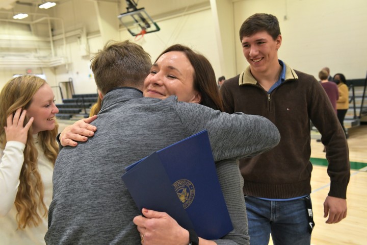 Students crowd around Milken Educator Award recipient Michelle Wolfe for congratulatory hugs. In addition to her work in the classroom, Michelle makes a point of getting to know every student as a whole person, providing a base of stability, support and consistency. She sponsors the National Honor Society and is involved with the Hardy County Community Foundation, Lost River Projects and the American Woodmark Foundation, organizations her students work with on environmental and other community service projects.