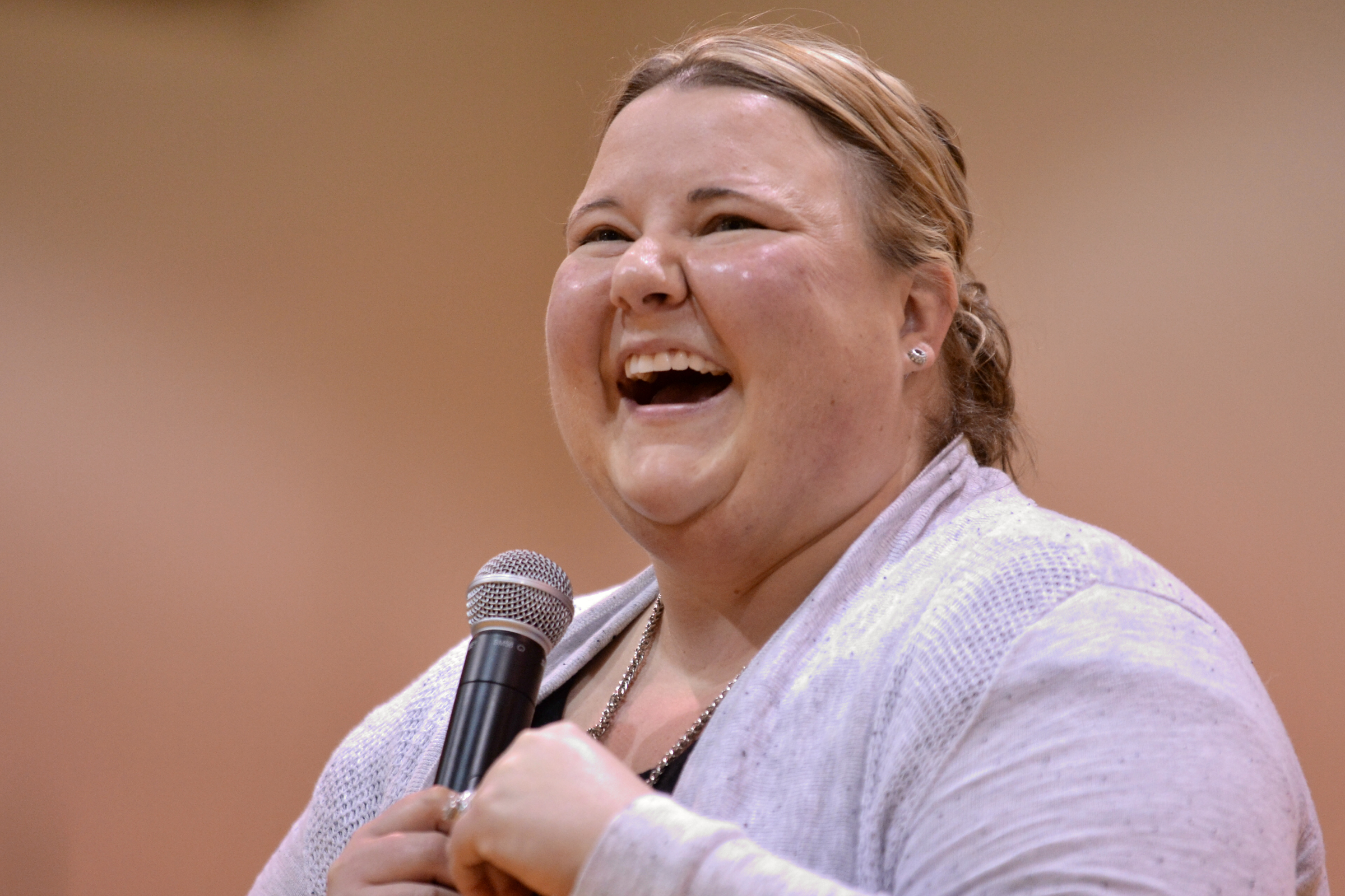 Bode Middle School | St. Joseph, MO | Feb 11, 2016Science teacher Deborah Siebern-Dennis addresses the assembly after Dr. Jane Foley, senior vice president of the Milken Educator Awards, names her Missouri's 2015-16 Award recipient. Foley asks Siebern-Dennis about the technology she uses in her classroom, and Siebern-Dennis, still flustered from the excitement of the surprise Award notification, turns to her students in the bleachers, who shout out the names of various apps and platforms. "That's what they're comfortable with," Siebern-Dennis says. "That's how they learn."