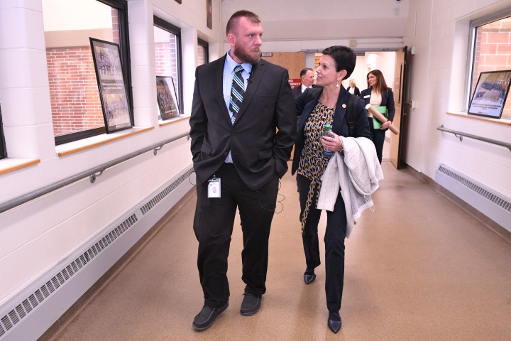 Cody High School | Cody, WY | May 01, 2024Still taking in the excitement of the day, newly-minted Milken Educator Principal Nathan Tedjeske gives Stephanie Bishop, vice president of the Milken Educator Awards, a tour of Cody High School. Principal Tedjeske lives and breathes the CHS motto: "Every Student. Every Chance. Every Day." With an emphasis on high-quality teaching, Career and Technical Education (CTE) opportunities, and ACT prep classes, he helps students build a strong foundation for future success.