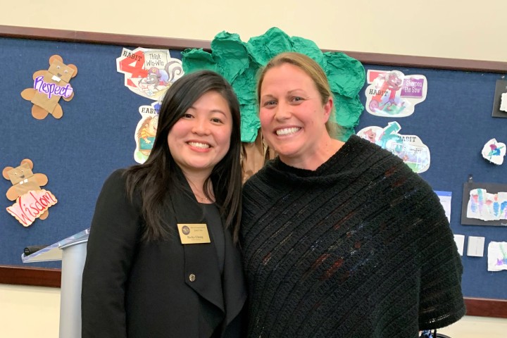 Hamilton Elementary School | Pasadena, CA | Feb 20, 2019Becky Cheng (left), district director for California U.S. Representative Congresswoman Judy Chu, congratulates Nichole Anderson on her Milken Educator Award.