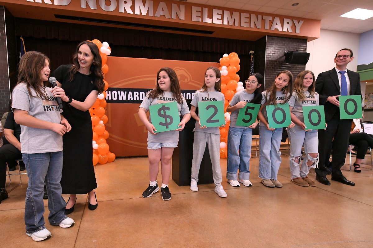 How much is the cash prize? Milken Educator Awards Vice President Jennifer Fuller brings a student up to ask. One digit at a time, students hold up cards representing the amount of the Award. When Texas Education Commissioner Mike Morath reveals the final zero, the room starts to buzz: That makes $25,000!