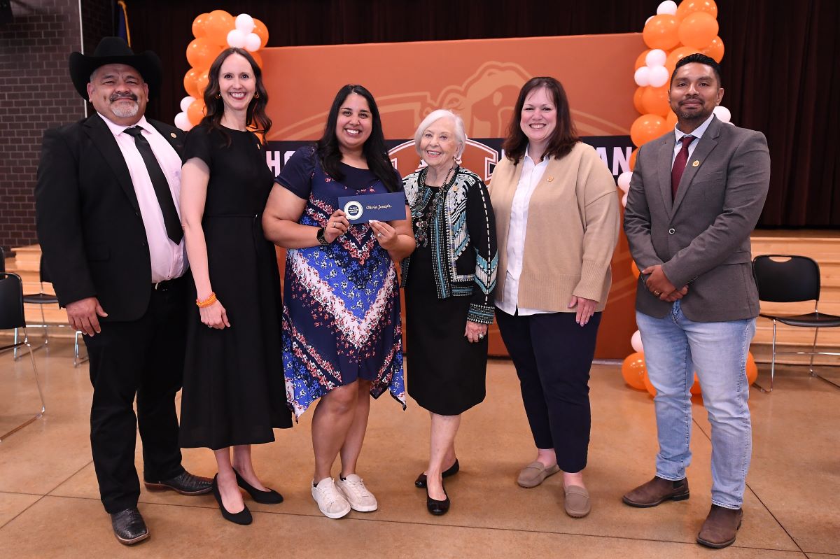 From left: Rogelio Garcia (TX ‘10); Milken Educator Awards Vice President Jennifer Fuller (TX '17); recipient Olivia Joseph (TX '25); Margaret Leeds (CA ‘87); Kristina Carssow (TX ’11); and Juan Dominguez (TX ‘23).