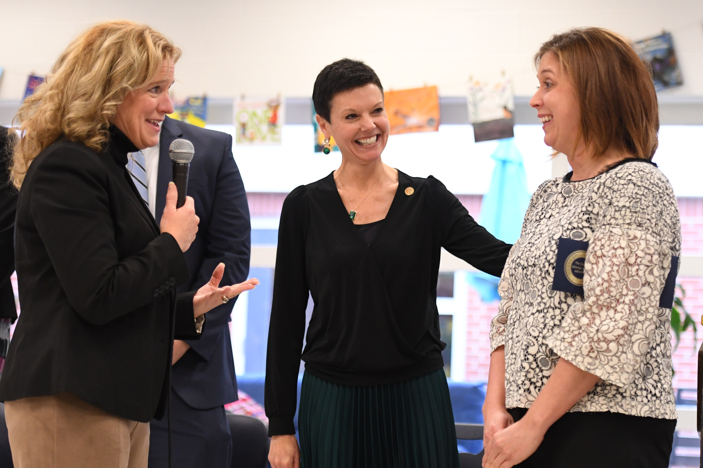 Cumberland Elementary School | Cumberland, VA | Dec 14, 2022With Milken Educator Awards Vice President Stephanie Bishop (center) looking on proudly, Virginia Superintendent of Public Instruction Jillian Balow congratulates Pamela Stepko on her Milken Award: "Teaching is the most important calling, and the most important profession in the whole world. Thank you for what you do every day."