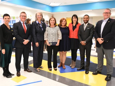 From left, Stephanie Bishop (VA '01), vice president of the Milken Educator Awards; Joshua Cole (VA '06); Dr. Lisa Bowman Newell (VA '04); recipient Pamela Stepko (VA '22); Laura Marshall (VA '08); Laura Lay (VA '05); Ryan James (VA '17); and Wade Whitehead (VA '00).