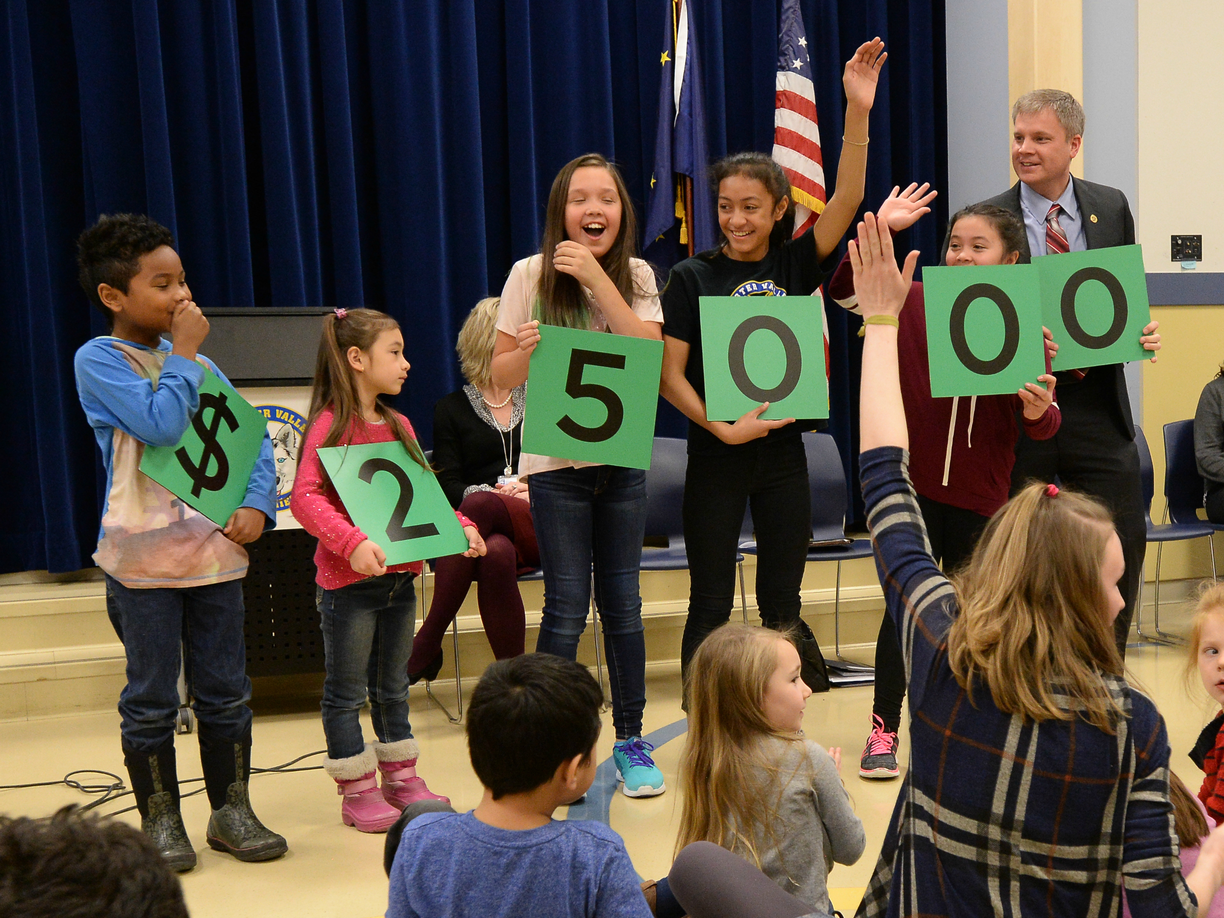 Chester Valley Elementary | Anchorage, AK | Nov 22, 2016The teacher who wins the Milken Educator Award will take home a cash prize — but how much? One digit at a time, students hold up cards representing the amount of the Award. When Dr. Michael Johnson, Alaska's commissioner of education and the state's 2008 Milken Educator, brings in the final zero, the crowd explodes with excitement at the total: $25,000!