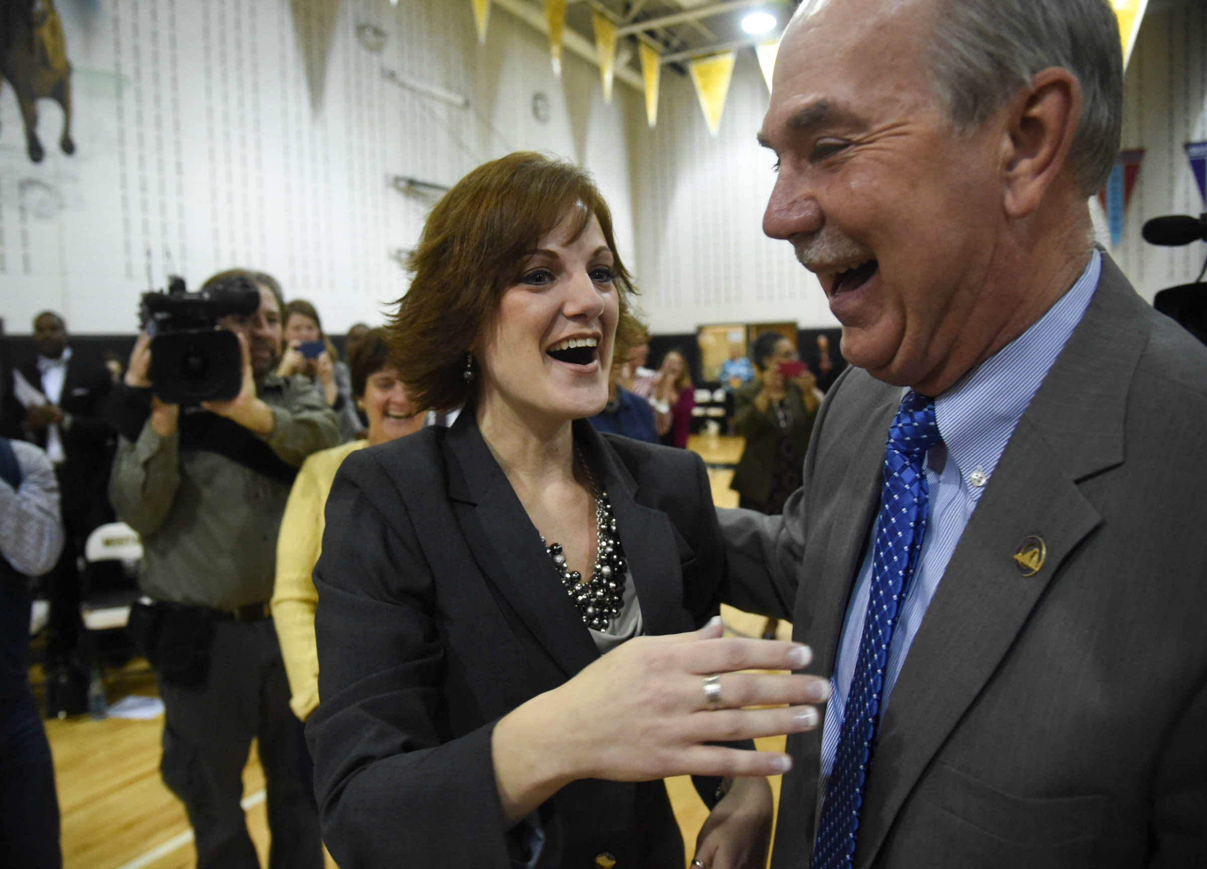 Hugo A. Owens Middle School | Chesapeake, VA | Dec 11, 2015A very surprised Principal Amber Dortch receives warm congratulations on her Milken Educator Award from Dr. Steven R. Staples, Virginia superintendent of public instruction.