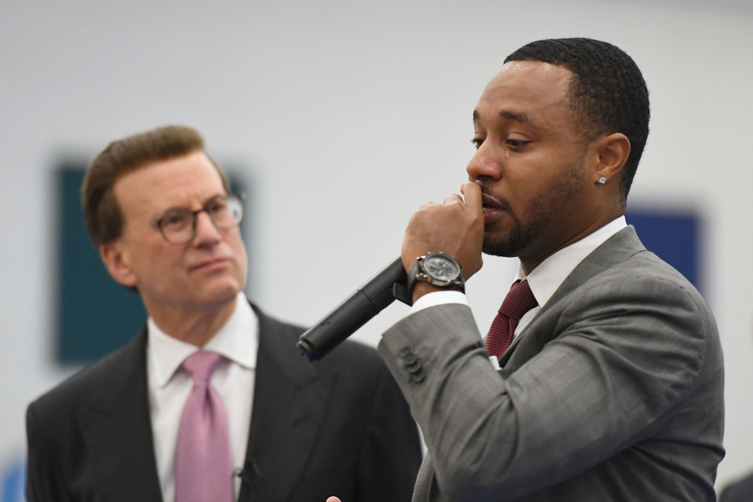 Lucille M. Brown Middle School | Richmond, VA | Nov 15, 2017With tears running down his cheeks and Milken Family Foundation Chairman and Co-Founder Lowell Milken looking on proudly, Ryan James addresses the assembly gathered in his honor. "I'm going to save my voice, because we are going to work today," he says. James credits his family for his success: "I wish my grandfather could see this moment, because when I look at my male role models, he was it—and that's what I try to do," he says. He also thanks his mother, Chrisantha James, "who put this idea into my head to be a teacher when I was in eighth grade." Chrisantha James works in professional development for the Richmond Public School District and attended the assembly, but neither she nor her son knew what was in store until James' name was announced.