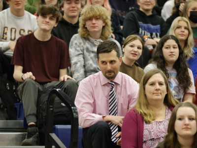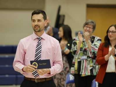 Washburn Rural High School | Topeka, KS | Apr 26, 2022With veteran Milken Educators Linda Dishman (KS '18) and Alice Bertels (KS '00) looking on, Ryan Pfeifer gets a special congratulatory hug from veteran Milken Educator Brad Nicks (KS '09). Ryan was a student in Brad's high school math class, and Brad is the teacher who inspired Ryan to pursue a career in education.