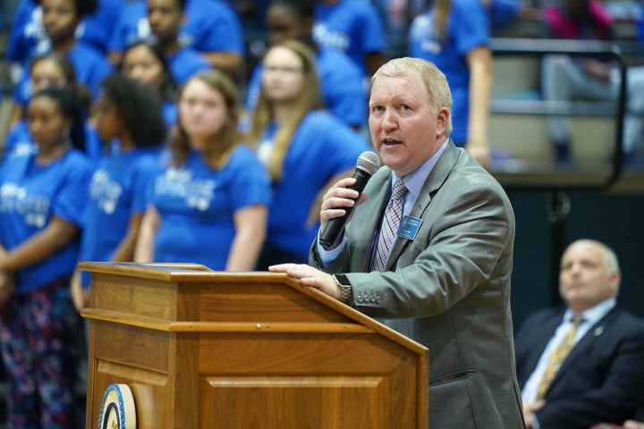 Carter G. Woodson Middle School | Hopewell, VA | Nov 06, 2019Everyone is ready! Carter G. Woodson Middle School Principal Shannon Royster calls the midday assembly to order.