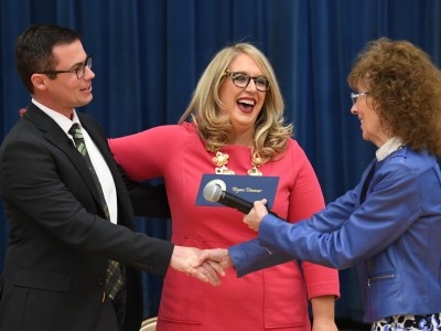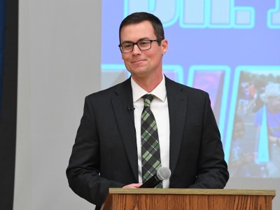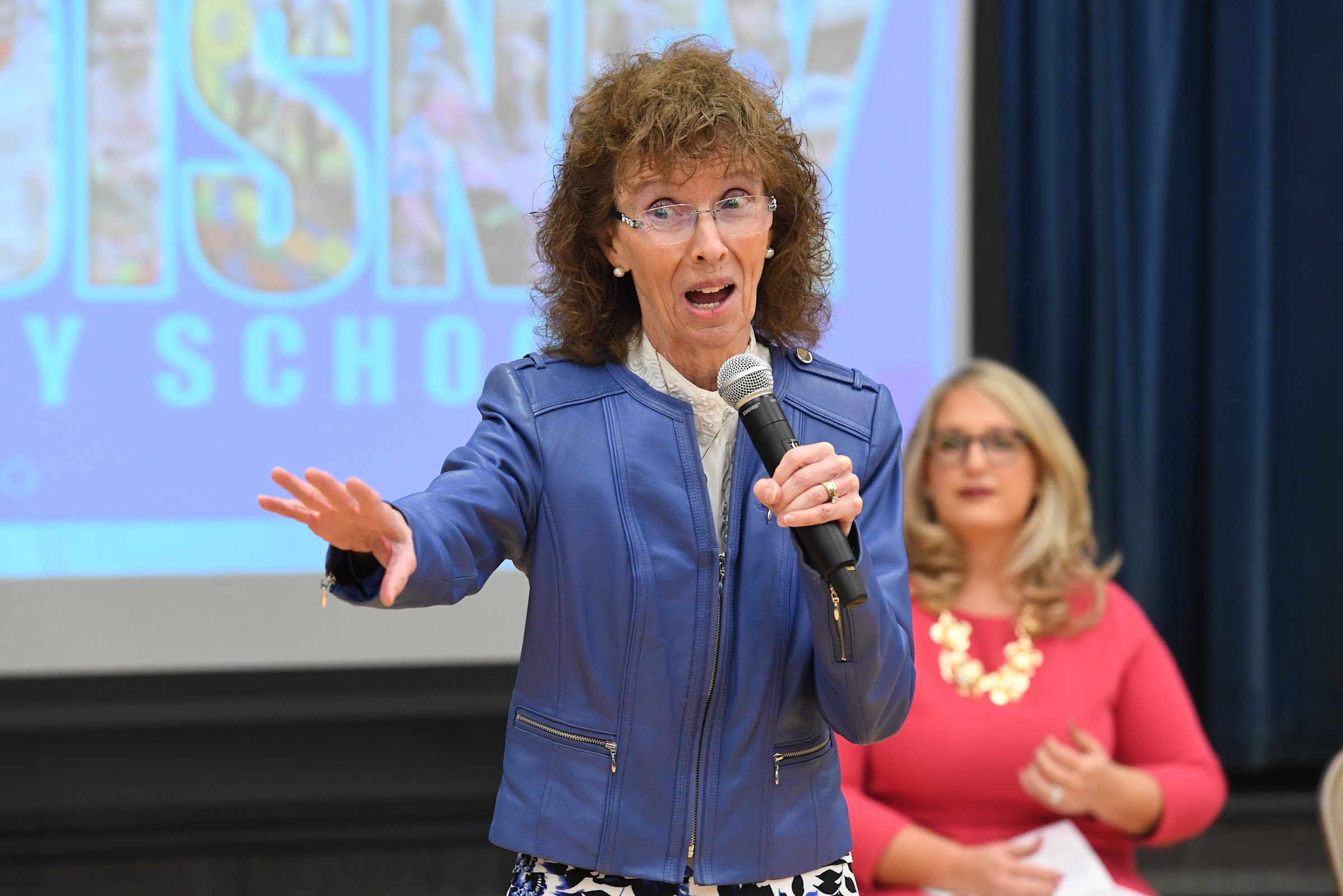 Dr. Jane Foley, senior vice president of the Milken Educator Awards, tells the children that one of the very best educators in the country is right here at Walt Disney Elementary—and that person is about to receive an important national honor. Indiana Secretary of Education Dr. Katie Jenner looks on with keen interest.