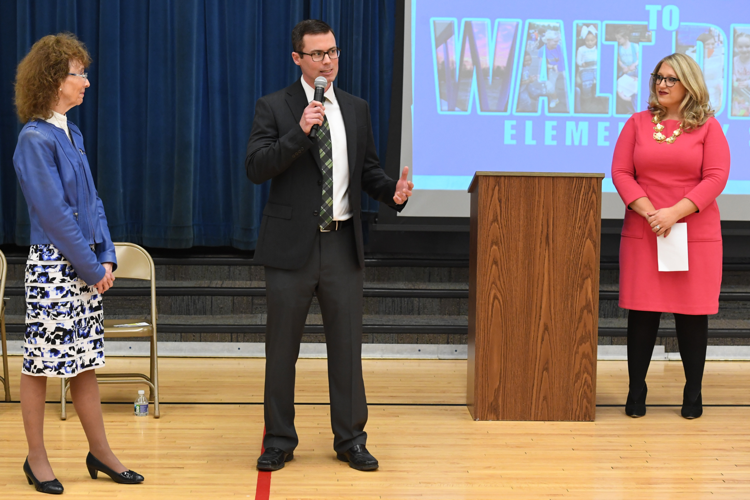 Walt Disney Elementary School | Mishawaka, IN | Mar 16, 2022When Principal Towner takes the microphone to address the assembly gathered to watch his Milken Educator Award surprise, emotions run high throughout the room. "A school is a very powerful community," he says, thanking staff for their hard work. "I learn from you, I'm inspired by you, and I hope that in some way I'm returning that inspiration to you." Then, to students: "Turn around, look at your teachers, and heap praise on them. Thank them."