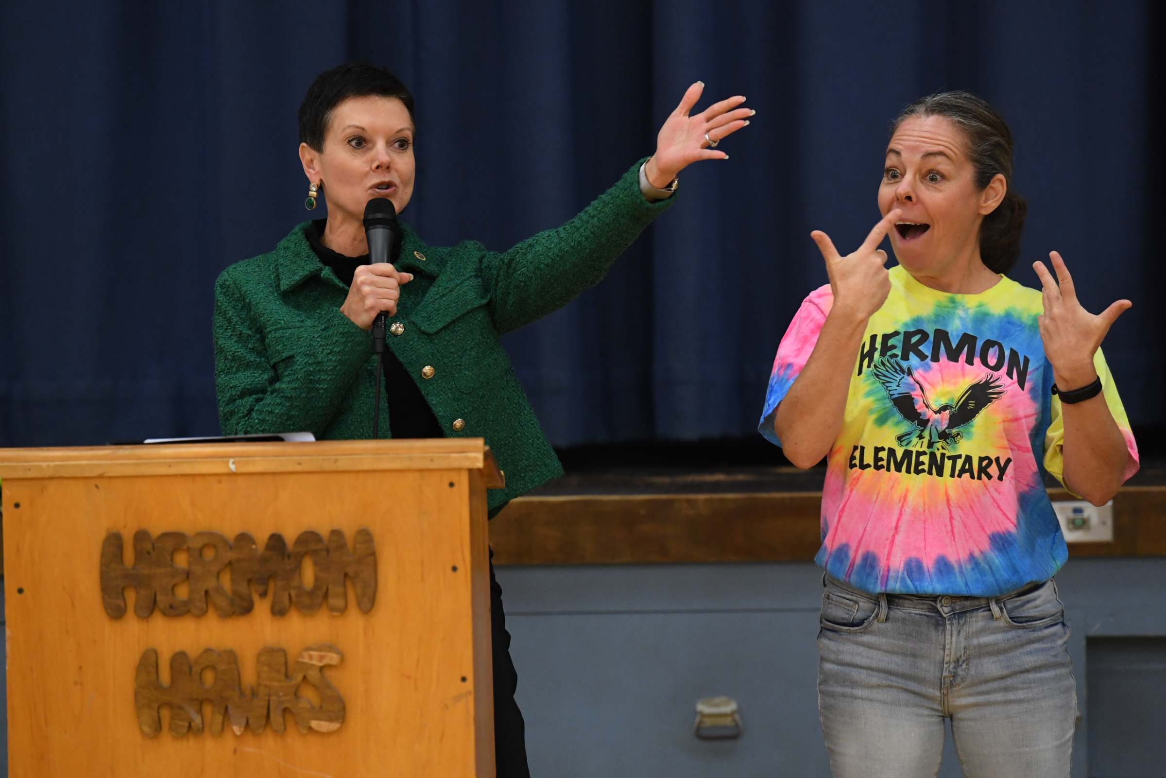 Patricia A. Duran School | Hermon, ME | Nov 01, 2022Stephanie Bishop, vice president of the Milken Educator Awards, tells the assembly that one of the very best teachers in the country is right here in Hermon — and that person is about to receive an important national honor. The expression on the sign language interpreter's face reflects the audience's excitement!