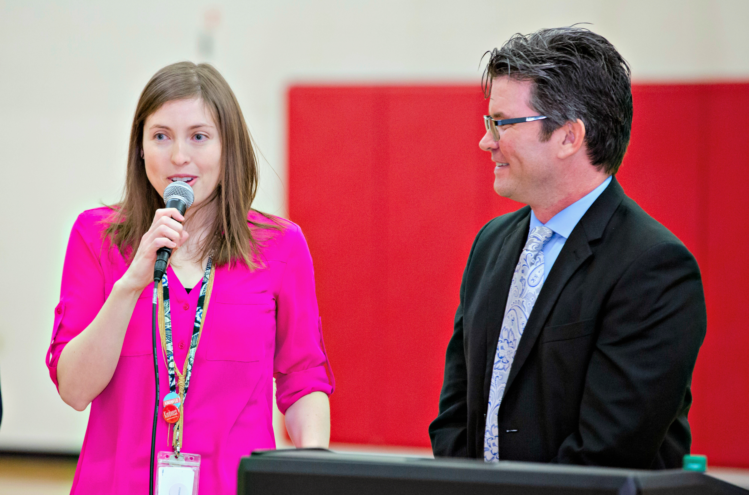 Northside Elementary School | Monroe, WI | Feb 22, 2019"I knew I wanted to be a teacher since third grade," fifth-grade teacher Sarah Compton tells the crowd gathered to witness her career-changing Milken Educator Award surprise. "I love it so much! ... It's the most important job. I think there are some kids here who would make amazing educators." Milken Family Foundation Senior Program Director Greg Gallagher looks on proudly.