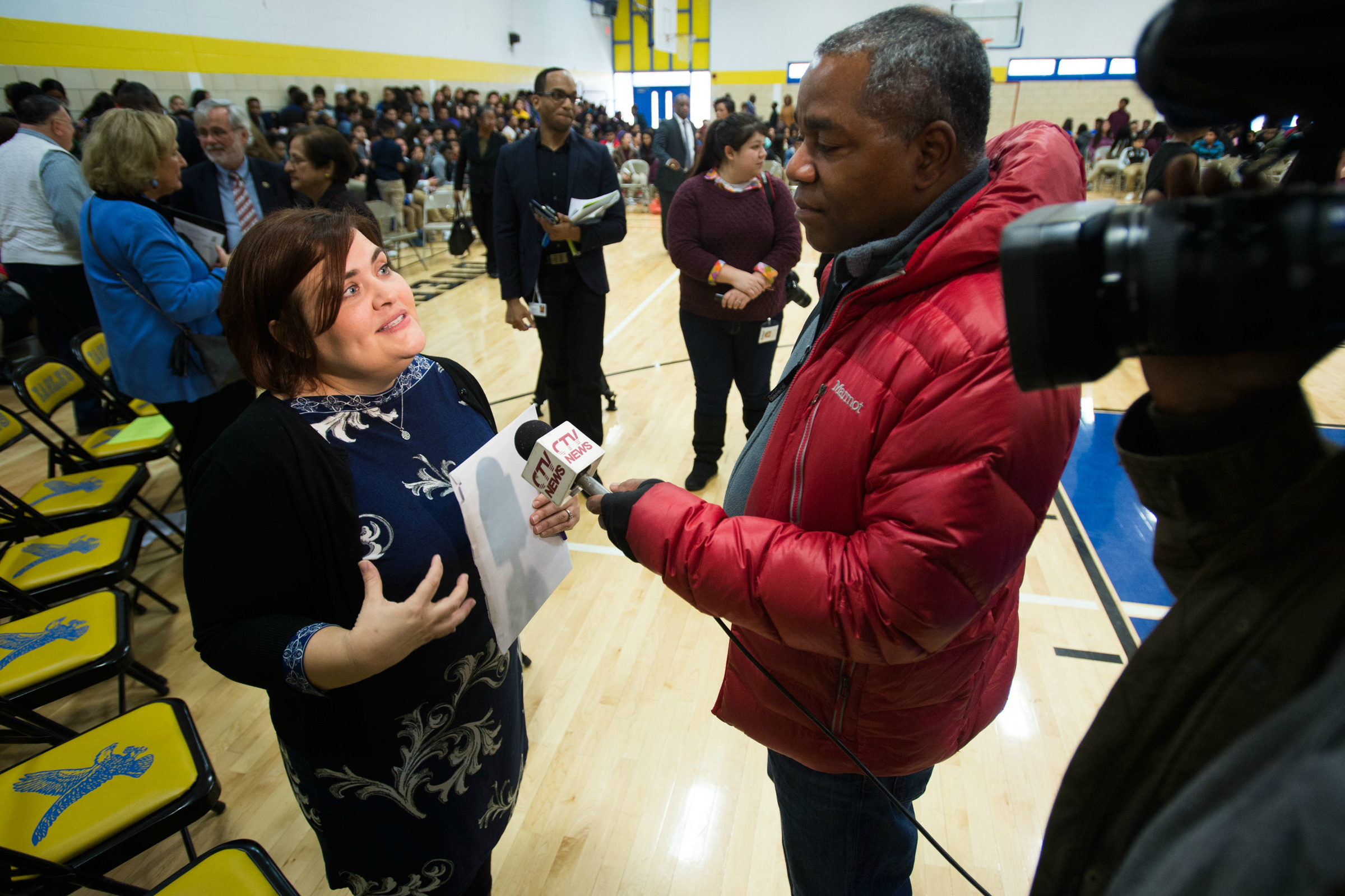 Oxon Hill Middle School | Fort Washington, MD | Feb 17, 2016Lights, cameras, action! Surrounded by microphones and video cameras, Milken Award recipient Angela Malone talks with reporters after her surprise notification. Malone, a trained actor, singer and dancer, works as a member of the inaugural Arts Integration in the Classroom Committee to help other teachers integrate the arts into STEM subjects.
