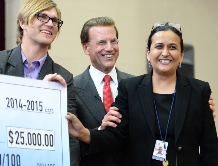 Friendly House Academia del Pueblo Elementary Charter School | Phoenix, AZ | Mar 26, 2015Milken Family Foundation Chairman and Co-Founder Lowell Milken (center) takes a moment to brace new Milken Educator Shalini Sharma as she lets the excitement sink in. Lowell knows that with this new honor, Shalini will have the opportunity to impact even more students’ lives in the future. Veteran Milken Educator Bradley Breuer (AZ '10), left, helps display Shalini's ceremonial check.