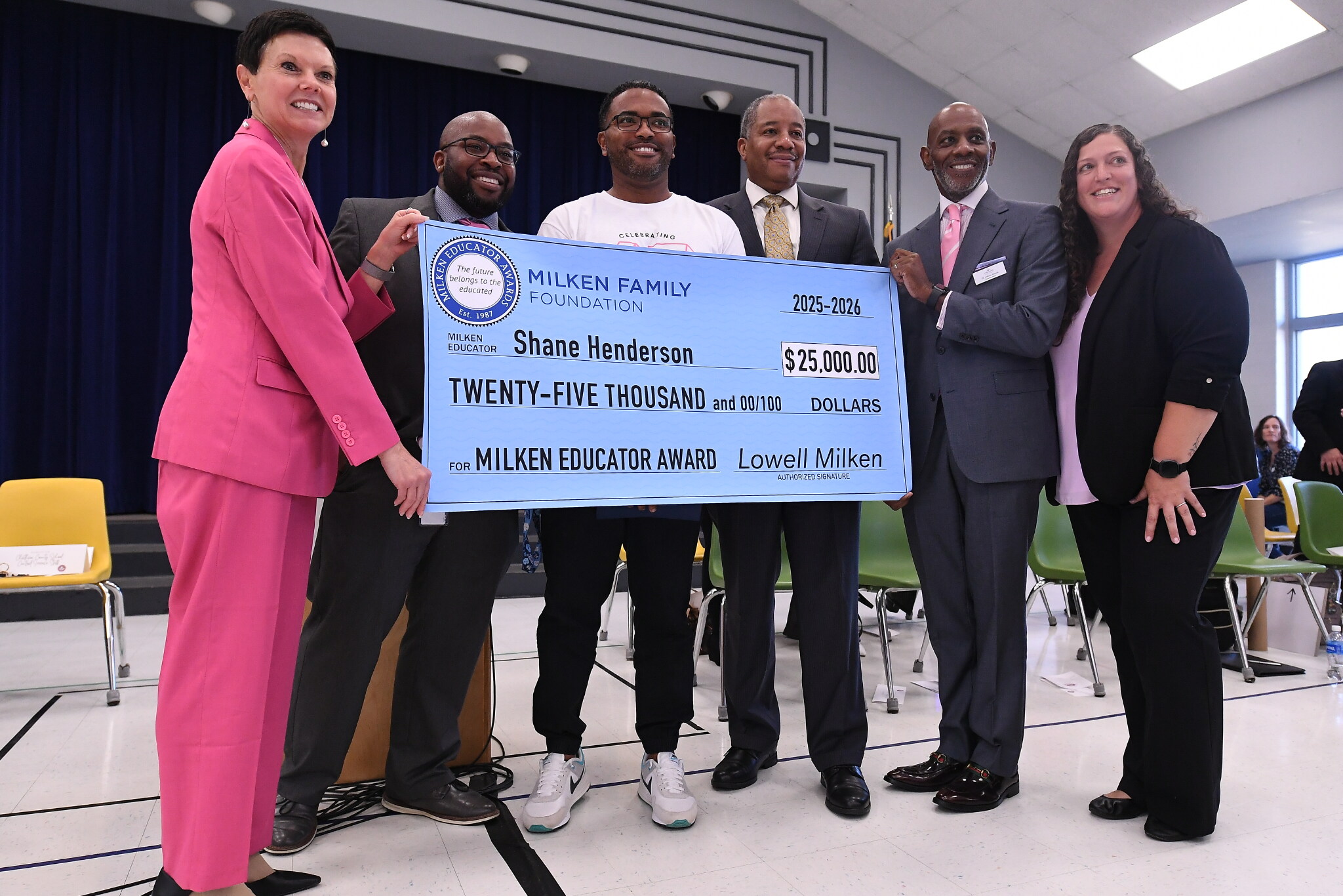 From left: Milken Educator Awards Vice President Stephanie Bishop; Pittsboro Elementary Principal Lemondrè Watson; recipient Shane Henderson (WV '25); North Carolina State Superintendent of Public Instruction Maurice "Mo" Green; Chatham County Schools Superintendent Dr. Anthony D. Jackson; and North Carolina Department of Public Instruction Educator Recognition Coordinator Elizabeth Santamour.