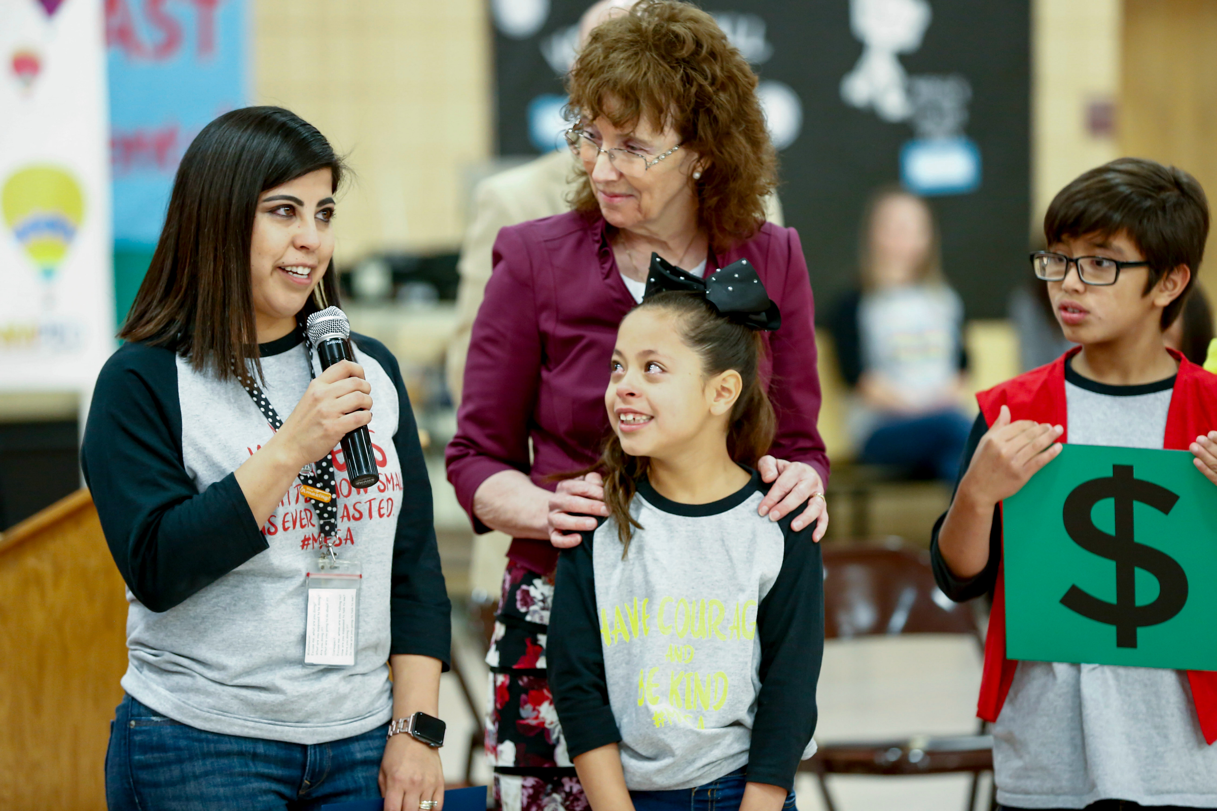 Mesa Elementary School | Clovis, NM | Nov 20, 2018Fourth-grade teacher Silvia Miranda addresses the students, staff and guests gathered in her honor, as Milken Educator Awards Senior Vice President Dr. Jane Foley and daughter Joanna Miranda, a Mesa third-grader, look on. "I do what everyone here does in their classrooms—fill our kids with love," she says.