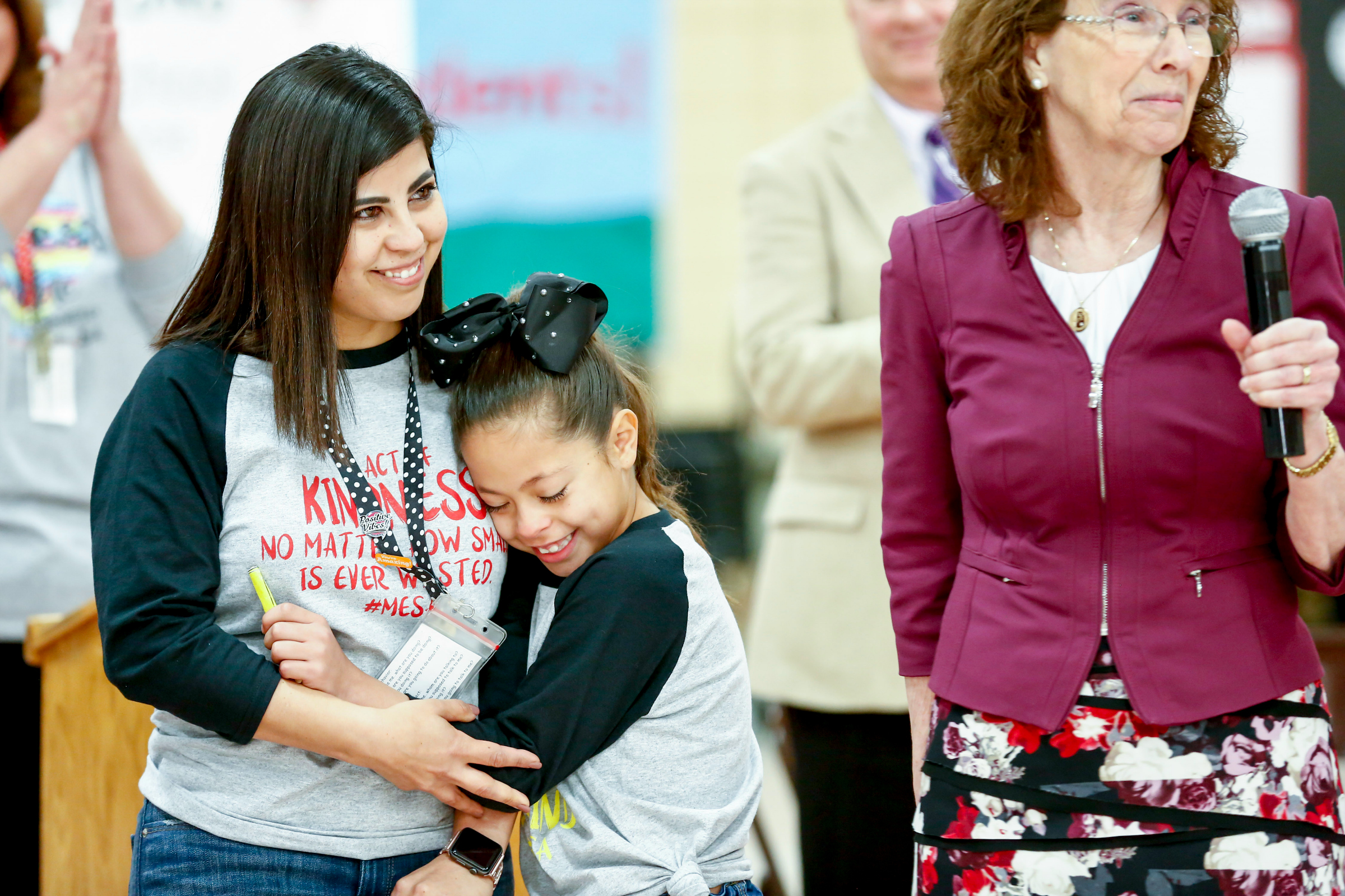 Mesa Elementary School | Clovis, NM | Nov 20, 2018With daughter Joanna wrapped around her waist, fourth-grade teacher Silvia Miranda listens to the long ovation from students, staff and guests at her surprise Milken Educator Award notification. Background, right: Dr. Jane Foley, senior vice president of the Milken Educator Awards.