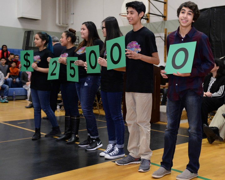 Waldo Middle School | Salem, OR | Jan 06, 2016Waldo Middle School students hold up cards displaying the amount of the cash prize one teacher is about to win: $25,000!