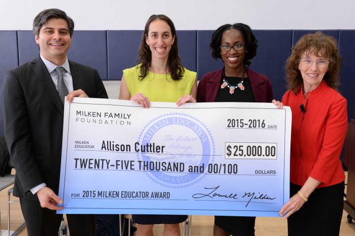 North Star Academy College Preparatory School | Newark, NJ | Dec 03, 2015Milken Educator Award winner Allison Cuttler beams as she holds her oversized $25,000 check with help from visiting dignitaries. From left, Evo Popoff, New Jersey Department of Education chief innovation officer and assistant commissioner; recipient Allison Cuttler; Shante Palmer, project specialist for U.S. Senator Cory Booker; and Dr. Jane Foley, Milken Educator Awards senior vice president.