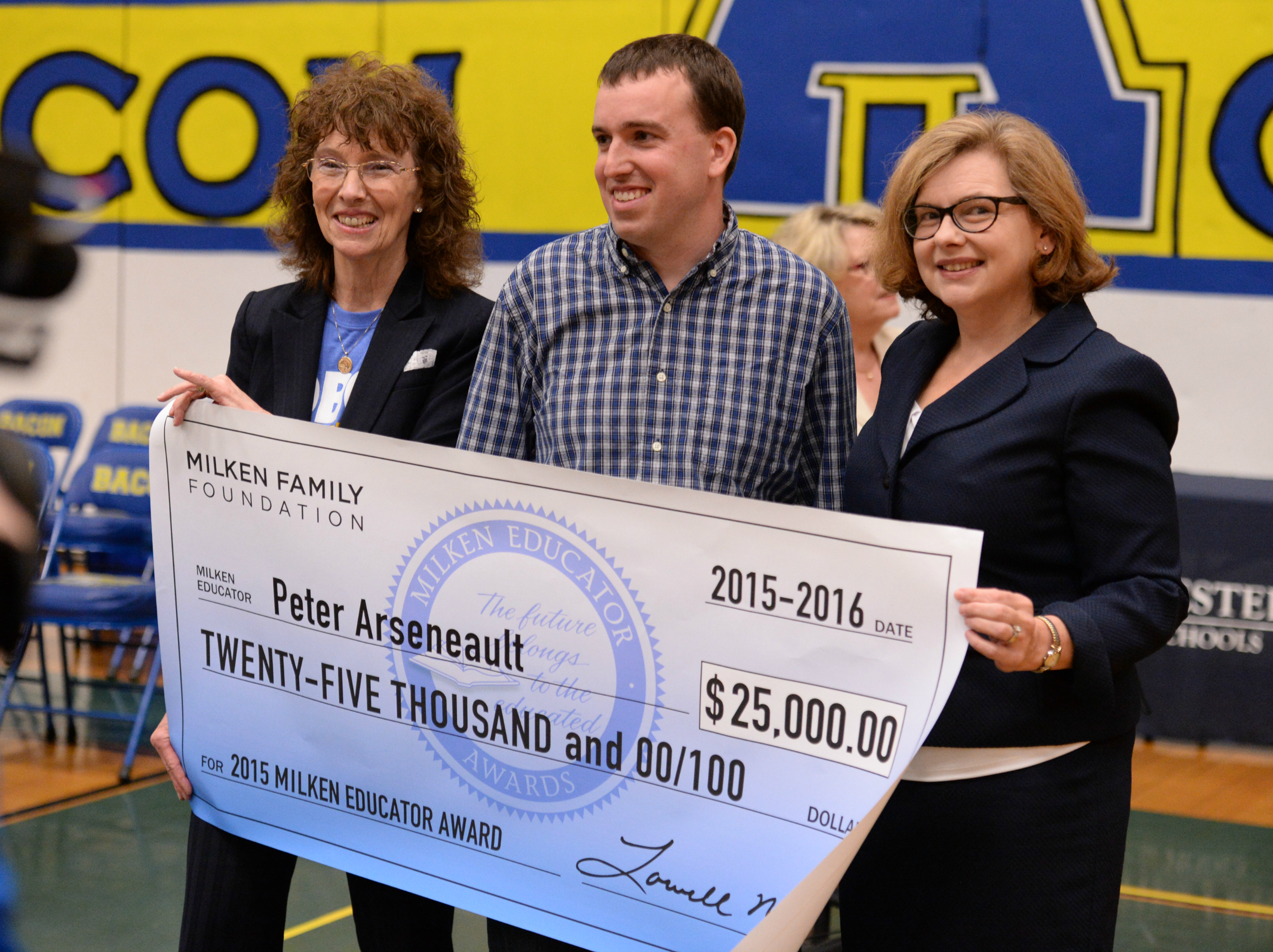 Bacon Academy | Colchester, CT | Nov 12, 2015Bacon Academy STEM teacher and Milken Educator Award winner Peter Arseneault beams as he holds his oversized $25,000 check. From left, Dr. Jane Foley, Milken Educator Awards senior vice president; recipient Peter Arseneault; and Connecticut State Education Commissioner Dr. Dianna R. Wentzell.