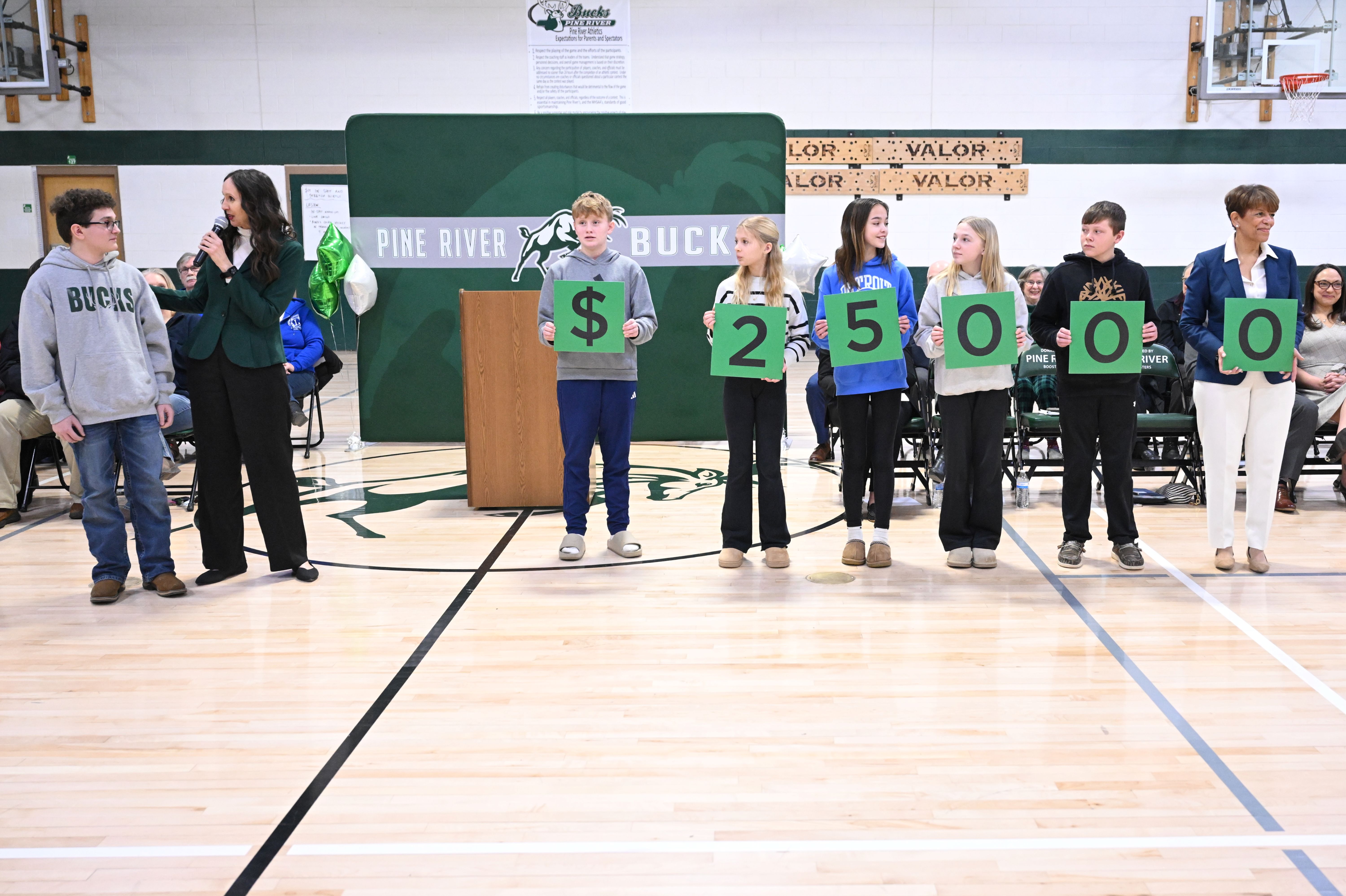 Pine River Middle School | LeRoy, MI | Feb 26, 2026The teacher who is about to receive the Milken Educator Award also takes home a cash prize. How much? One digit at a time, students hold up cards representing the amount of the Award. When the third zero is revealed by Michigan Chief Deputy Superintendent Dr. Sue Carnell, everyone is in awe: That makes $25,000!