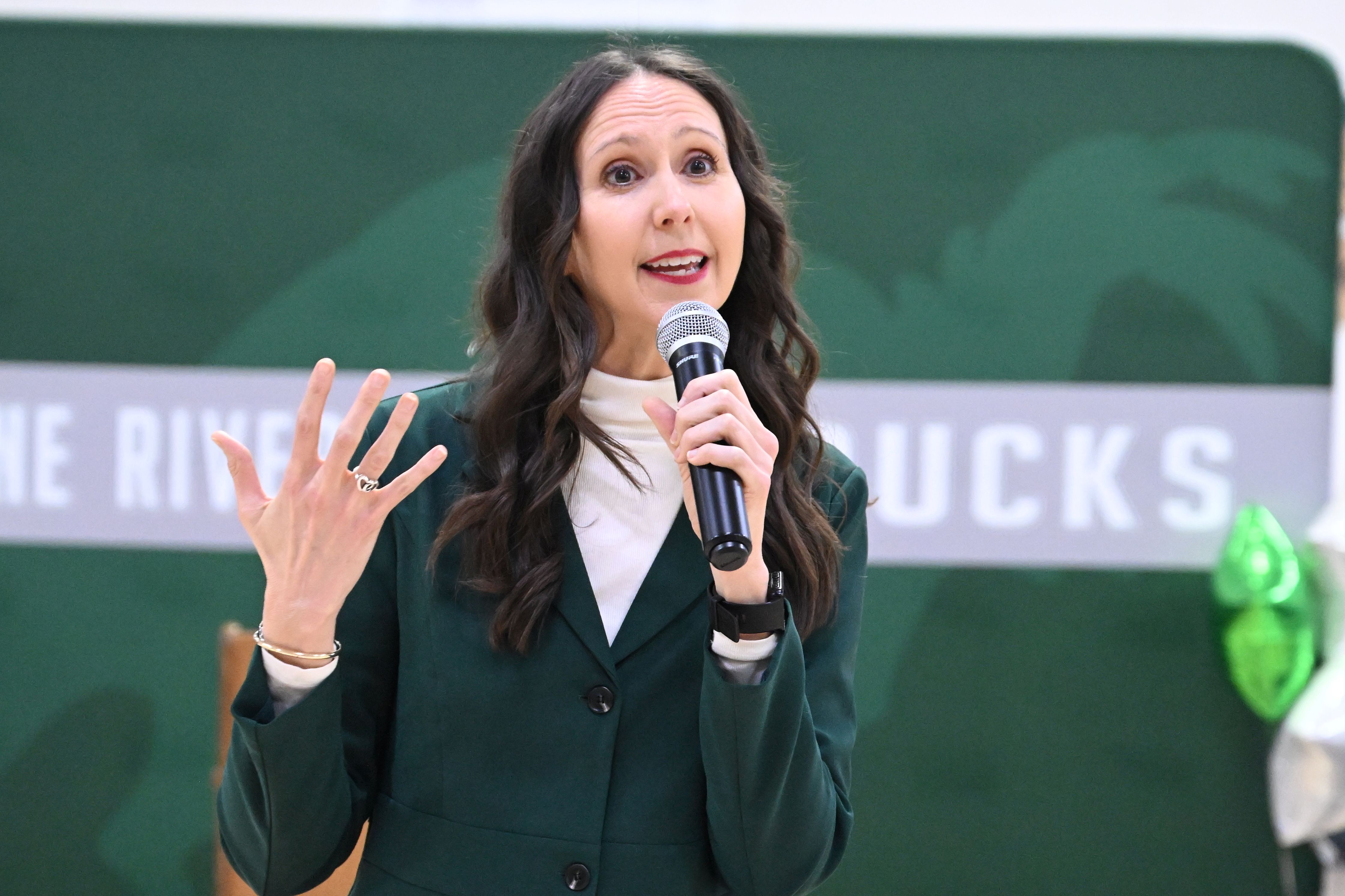 Milken Educator Awards Vice President Jennifer Fuller tells the assembly that one of the top educators in the country is right here at Pine River Middle School, and that person is about to receive an important national honor: the Milken Educator Award.