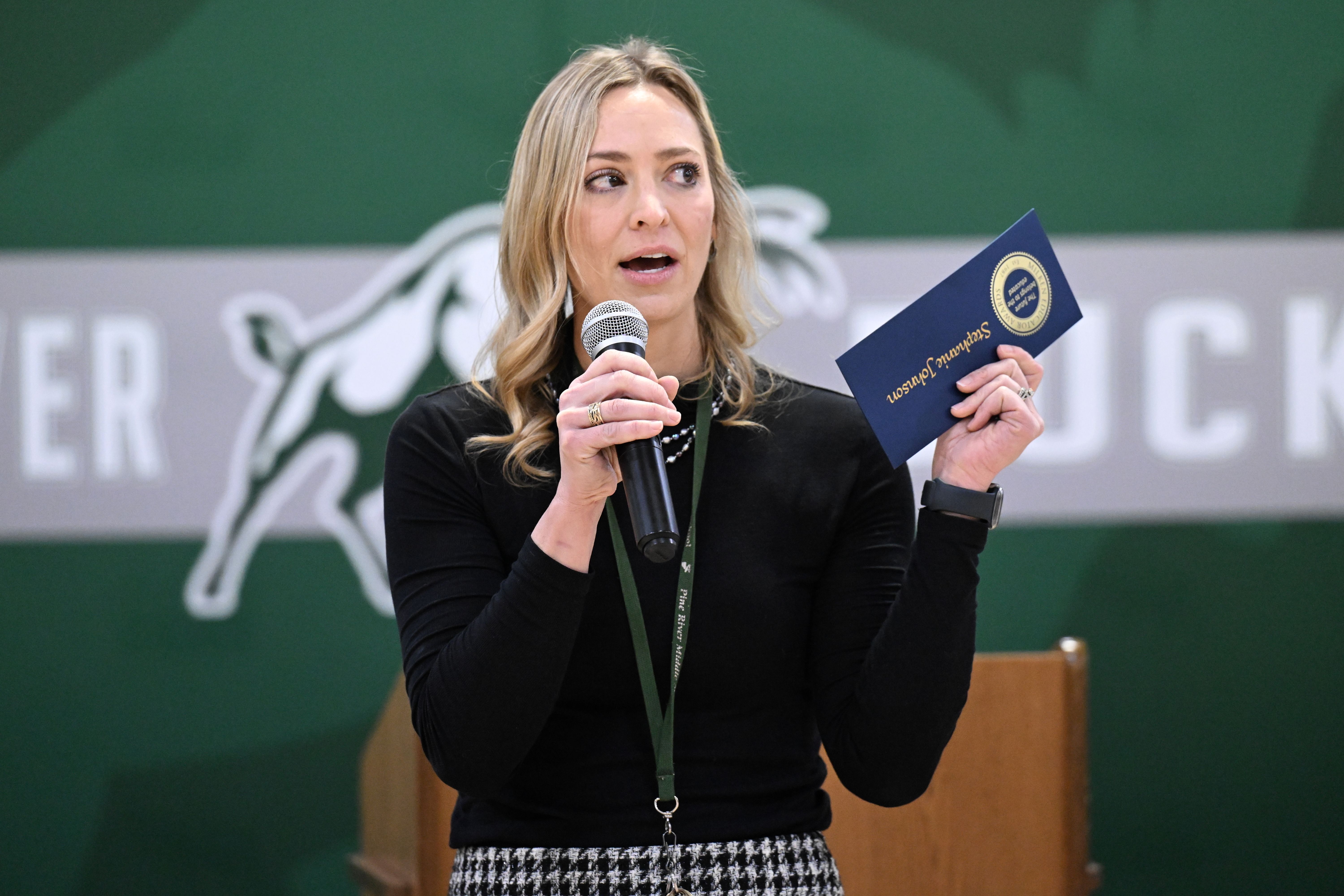 In addressing the assembly, Stephanie Johnson expresses her gratitude for the educators who have influenced her, impacted her and inspired her to become a teacher. "I can teach anywhere in the local area, and I choose Pine River because I love our school, I love our community and I love our students," she said. "I'm so proud to be part of this organization that educates our students and helps them to get to the places that they want to be."