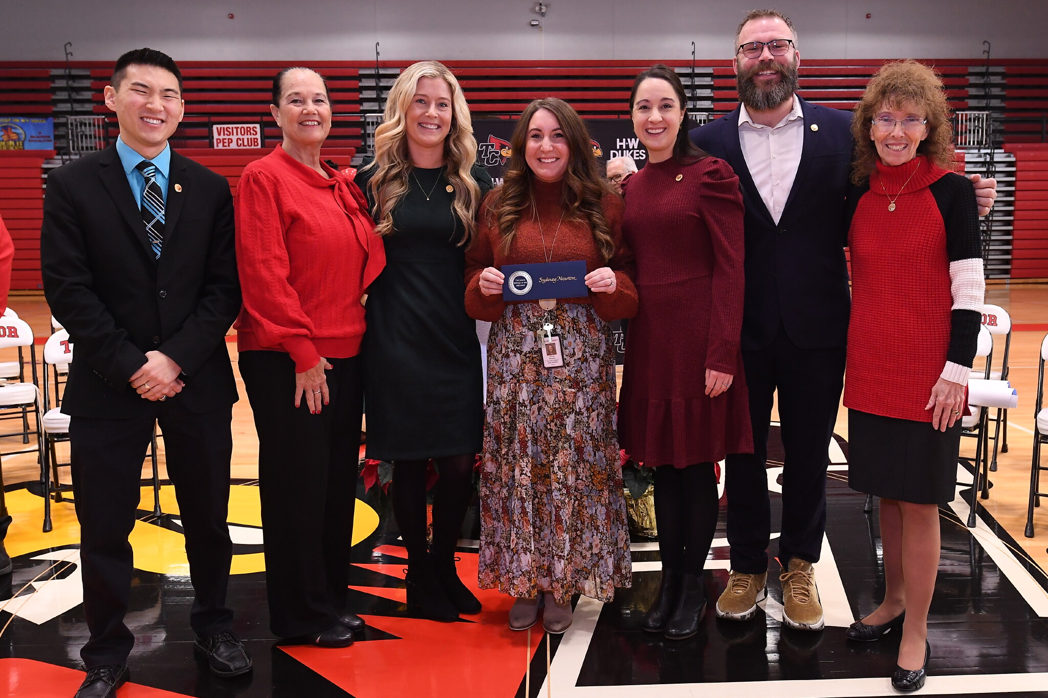 From left: Shane Baker (KY ‘23); Shelia A. Duncan (KY '01); Jenna Stewart (KY ‘24); recipient Sydney Newton (KY '25); Charlotte S. Buskill (KY ‘22); Kevin Dailey (KY ‘21); and Dr. Jane Foley (IN '94), senior vice president of the Milken Educator Awards.