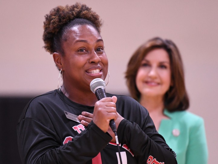 Union 8th Grade Center | Broken Arrow, OK | Apr 08, 2022As Oklahoma Superintendent of Public Instruction Joy Hofmeister looks on, Tamarah Danzy shares some thoughts with her students and colleagues.