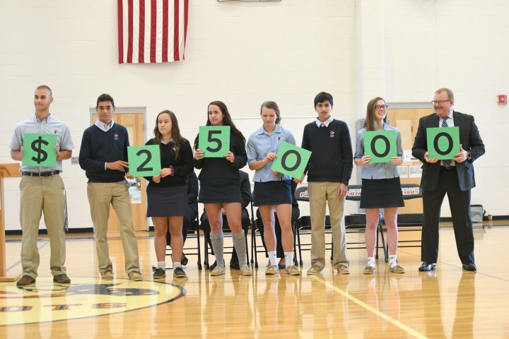 The Newark Charter educator who is about to receive the Milken Educator Award will also take home a cash prize—but how much? Students hold up cards representing the amount of the Award, one digit at a time. When Milken Family Foundation representative Larry Shamhart brings in the final zero, the crowd gasps at the total: $25,000!