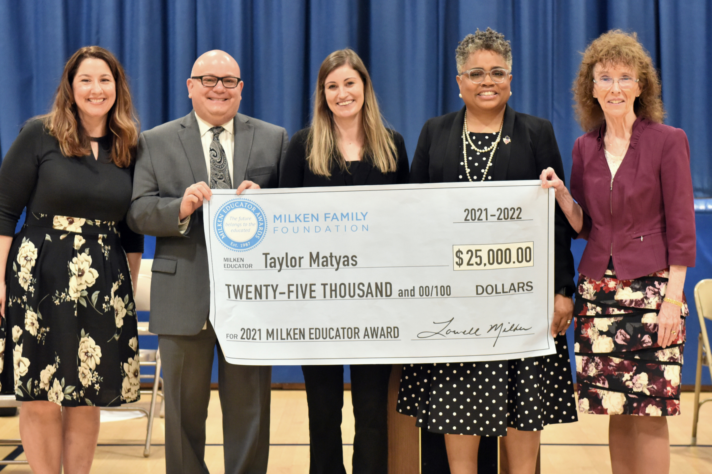 Laura Donovan Elementary | Freehold, NJ | Apr 01, 2022WOW, THAT'S TREMENDOUS! Colleagues and visitors help Taylor Matyas wrangle her oversized $25,000 Milken Educator Award check.