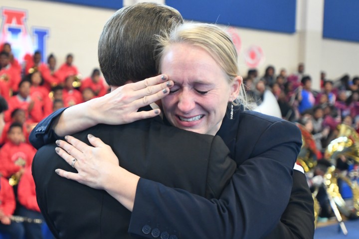 Alice M. Harte Charter School | New Orleans, LA | Dec 08, 2017Theresa Cross gets a congratulatory hug from Lowell Milken, chairman and co-founder of the Milken Family Foundation, as she makes her way to the front of the room at her surprise Milken Educator Award notification.