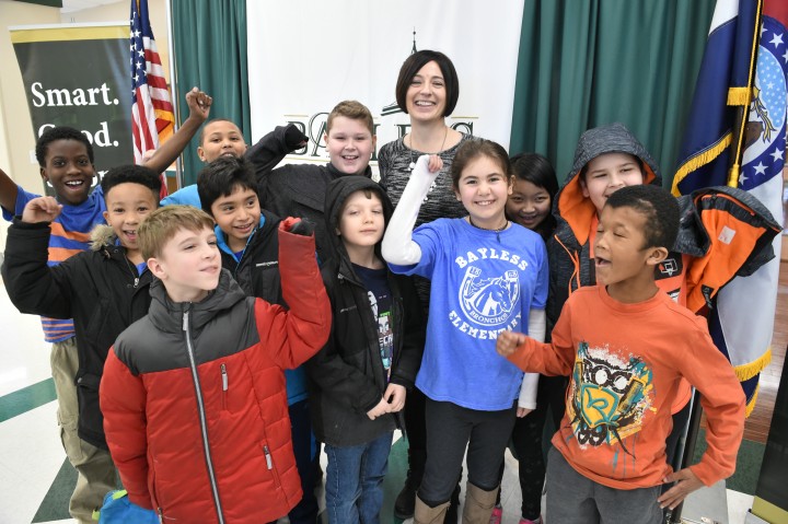 Bayless Elementary School | St. Louis, MO | Feb 13, 2019WE LOVE OUR TEACHER! Students cheer for Therese Shain at her surprise Milken Educator Award notification. Shain has taught at Bayless for a decade and includes students’ voices in the classroom, making them part of developing the mission, class rules, routines, academic goals and data charting process. She teaches a social skills group, as well as reading, writing and math groups. Shain’s students show great progress in all academic areas, meeting more than 90% of their reading goals, 80% of writing goals, and 80% of math.