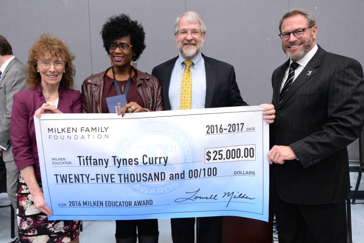 From left, Dr. Jane Foley, senior vice president of the Milken Educator Awards; recipient Tiffany Tynes Curry; Ohio Superintendent of Public Instruction Paolo DeMaria; and Columbus City Schools Superintendent Dr. Dan Good.