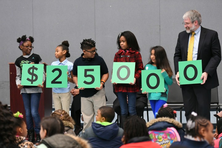 Weinland Park Elementary School | Columbus, OH | Jan 24, 2017Dr. Jane Foley, senior vice president of the Milken Educator Awards, has told the assembly that one teacher at Weinland Park is about to receive an important national award ... and it comes with a cash prize. But how much? One digit at a time, students hold up cards representing the amount of the Milken Educator Award. When Ohio Superintendent of Public Instruction Paolo DeMaria holds up the final zero, bringing the total to $25,000, students look to their friends in amazement.