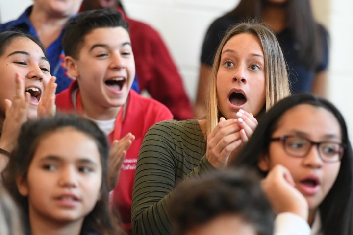 WAIT ... WHAT?  Math teacher Toni-Ann Palmisano is shocked to hear the news: She has just won a New Jersey Milken Educator Award and $25,000!
