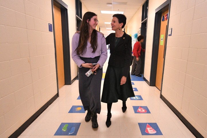Croft Community School | Charlotte, NC | Dec 18, 2024Milken Educator Awards Vice President Stephanie Bishop and recipient Vanessa Smith make their way back to the classroom after the assembly.